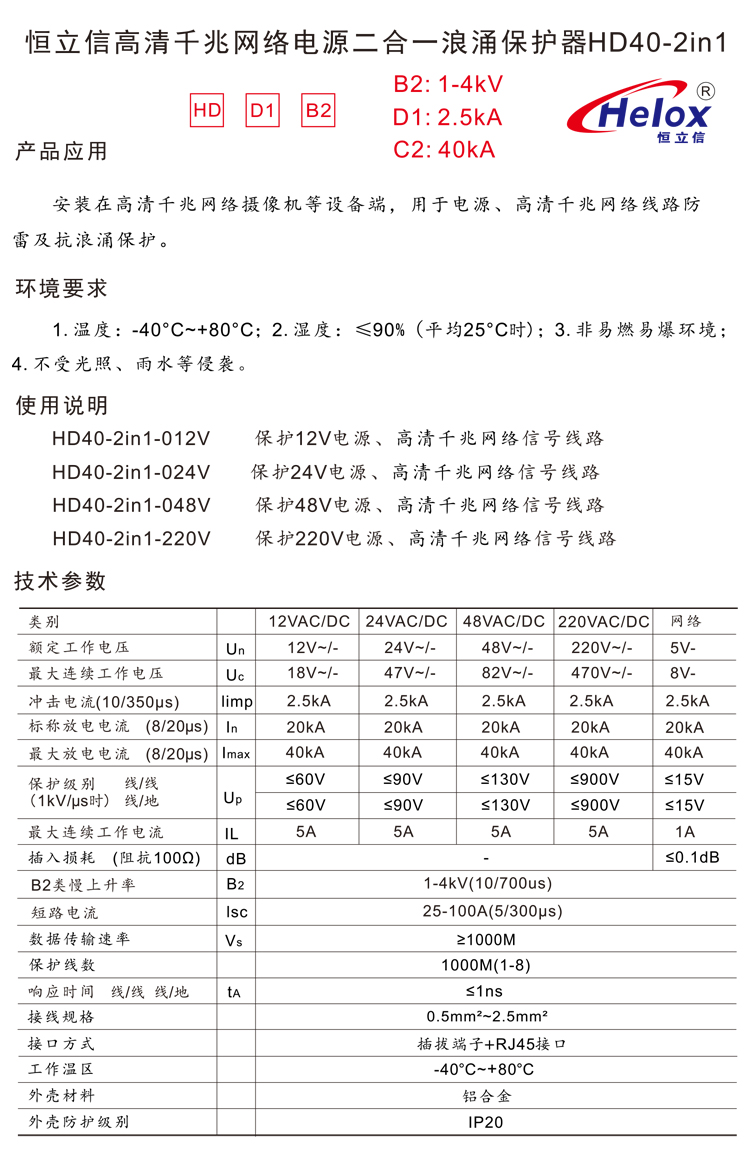 恒立信D1类高清千兆网电源二合一浪涌保护器(12V~220V) 1000M C2 40kA HD40-2in1