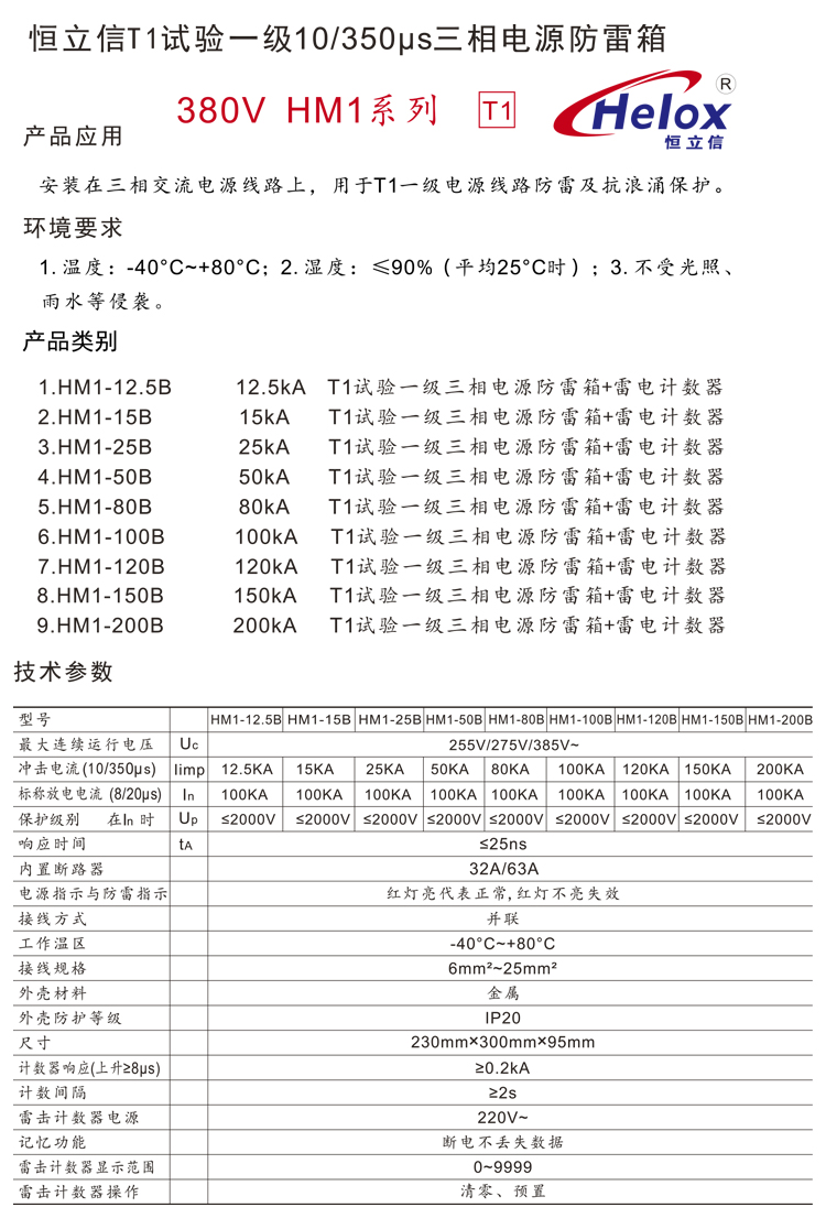 恒立信单相电220V一级电源防雷箱(12.5kA-200kA)T1试验 HM1-*B