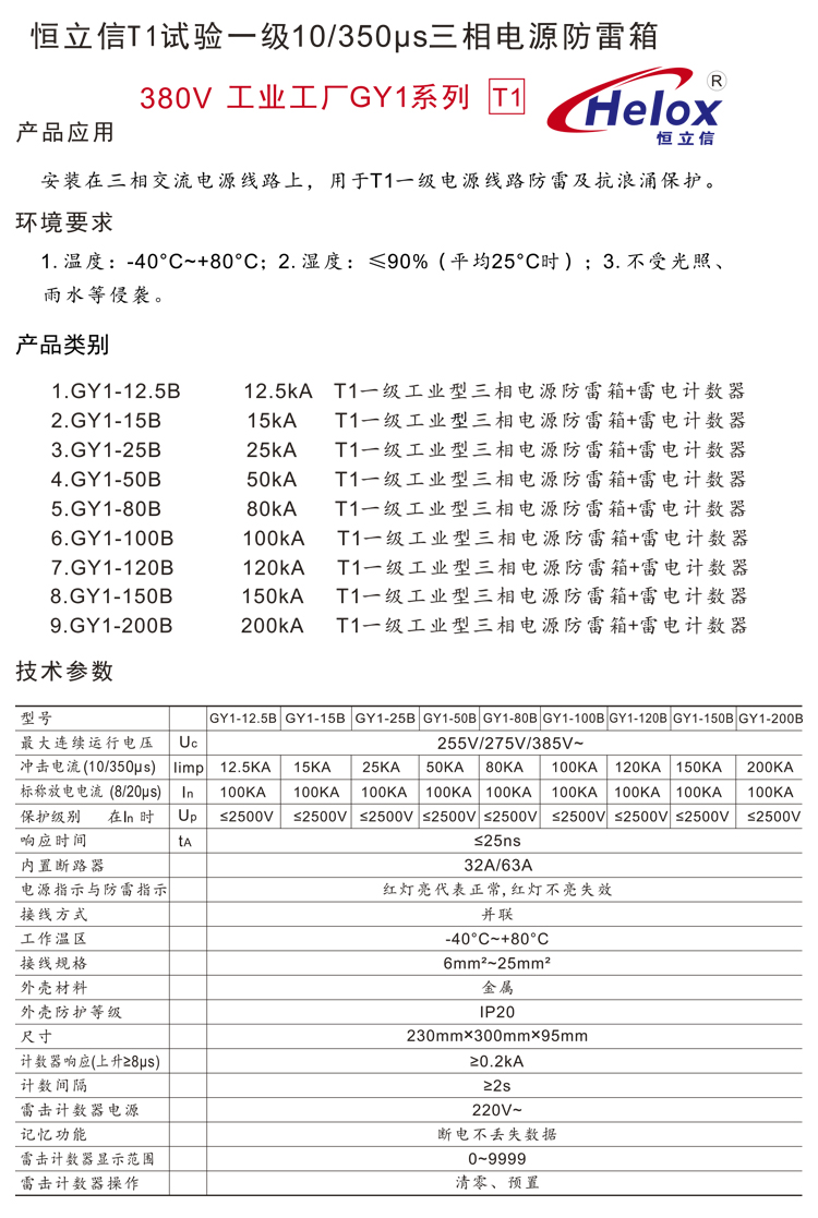 恒立信三相电380V工业工厂一级电源防雷箱(25kA-200kA) T1 GY1
