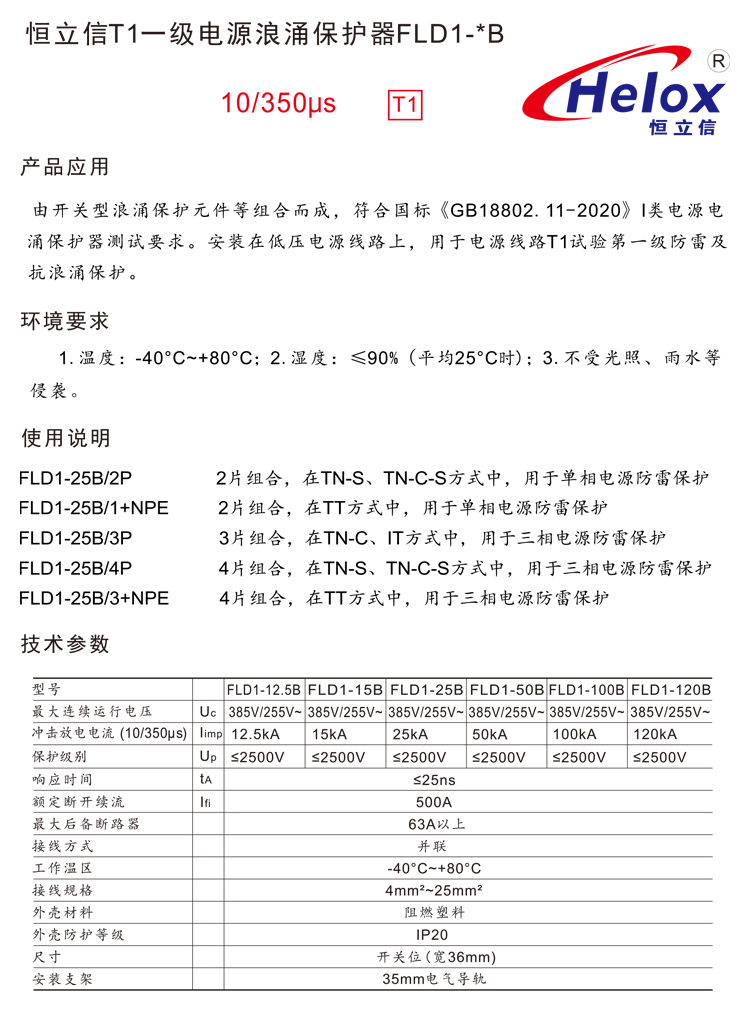 恒立信三相电380V一级电源防雷模块(12.5kA-120kA)4P T1试验 2.5kV 18mm FLD1-*B