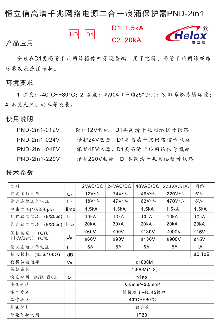 恒立信D1类高清千兆网电源二合一浪涌保护器(12V~220V) 1000M C2 20kA PND-2in1