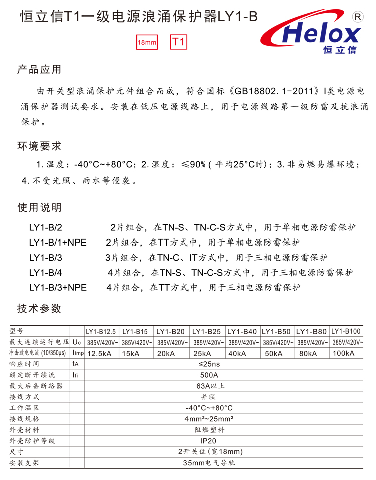 恒立信单相电220V一级电源防雷模块(12.5kA-100kA)2P T1试验 Uc 420V LY1-B