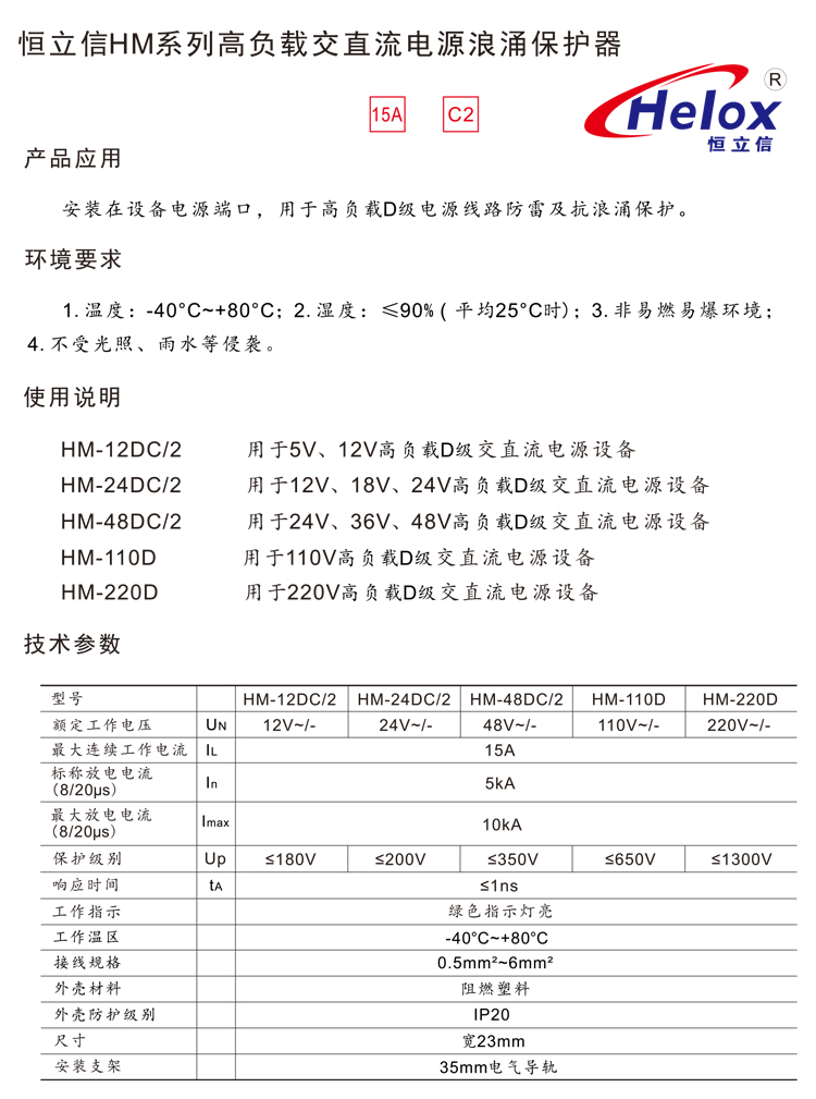 恒立信红色串联交直流电源防雷器(12V~220V) 15A 10kA HM系列