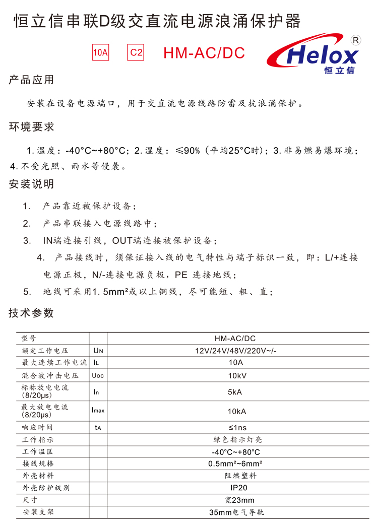 恒立信红色串联交直流电源防雷器(12V~220V) 15A 10kA HM系列