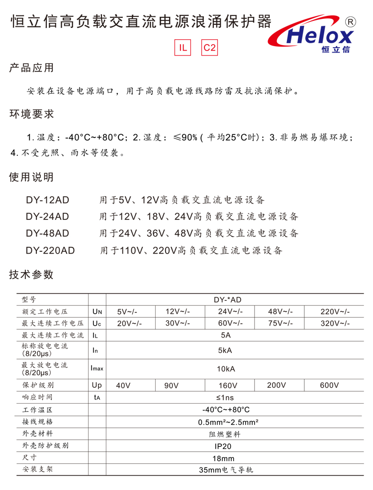 恒立信白色导轨串联交直流电源浪涌保护器(12V~220V) 5A 1ns 10kA DY-*AD