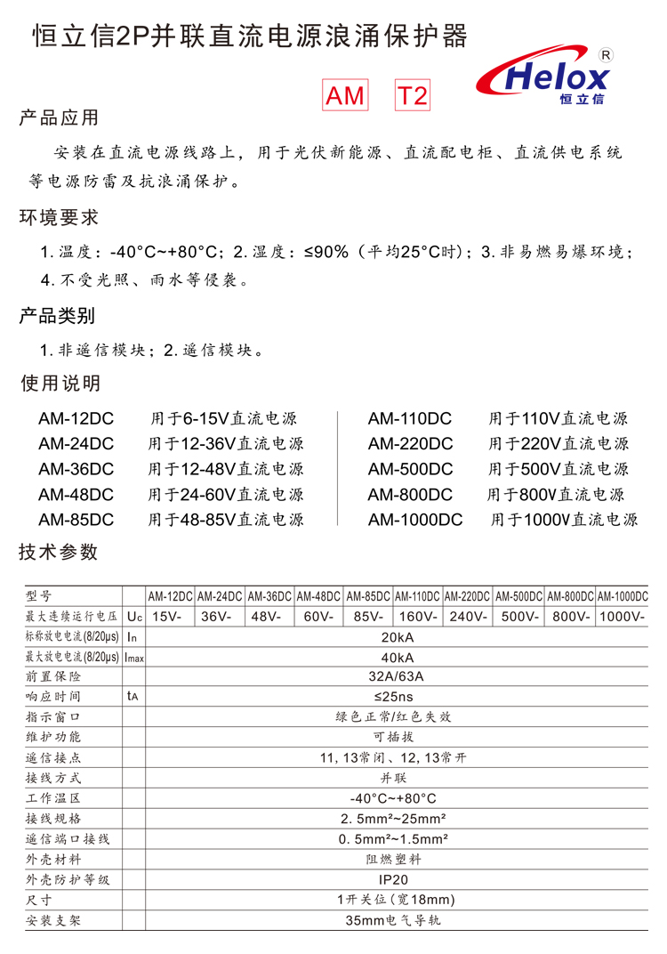 恒立信并联直流电源浪涌保护器(12V~1000V) 2P 40KA AM系列