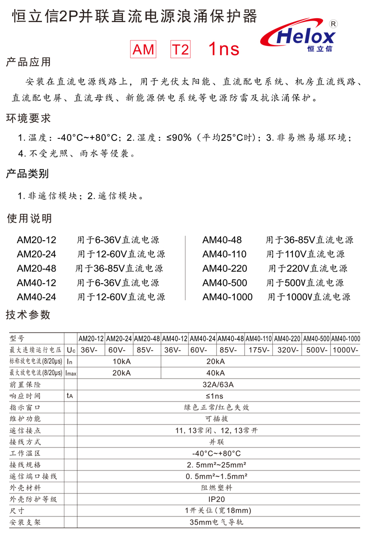恒立信并联2P光伏直流电源防雷器(12V~220V) 20kA、 40KA 1ns AM系列