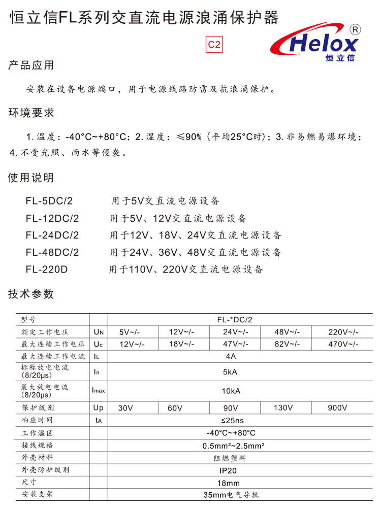 恒立信白色导轨交直流电源浪涌保护器(12V~220V) 4A 10kA 1ns FL系列