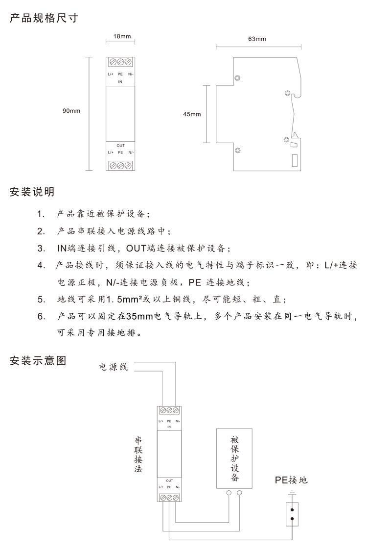 恒立信白色导轨串联高负载交直流电源浪涌保护器(5V~24V)1ns 10kA 5A DY-PRO