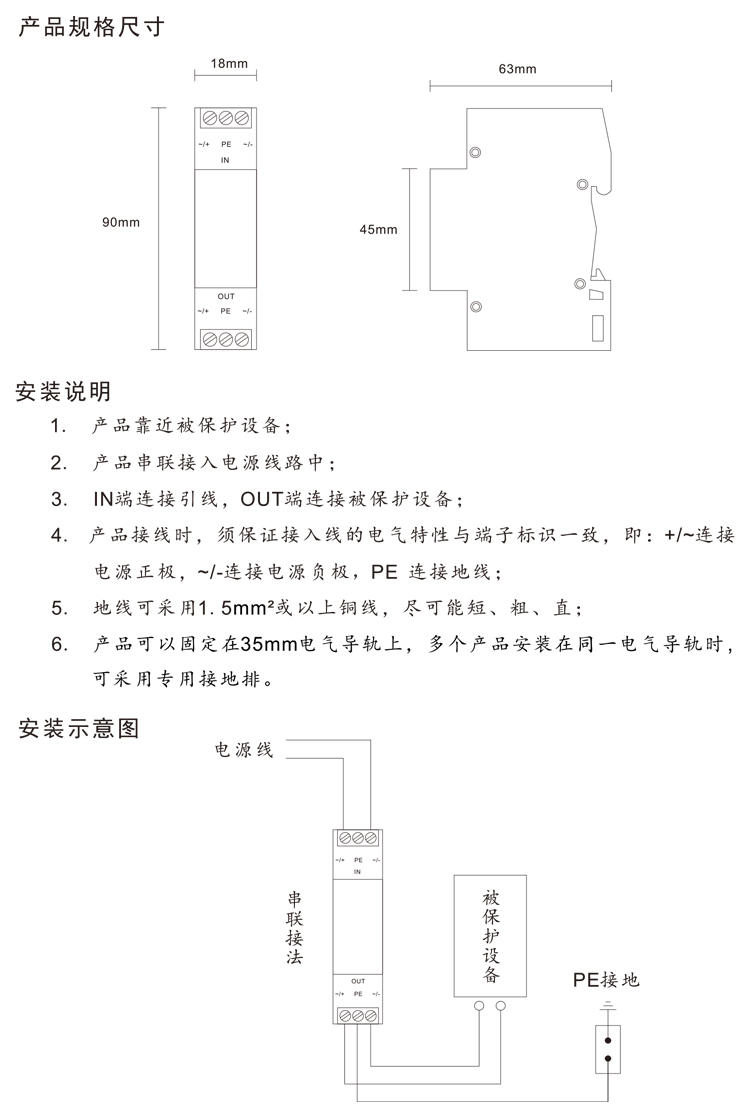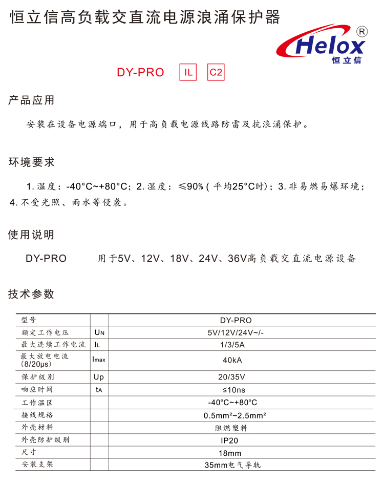 恒立信白色导轨串联高负载交直流电源浪涌保护器(5V~24V)1ns 10kA 5A DY-PRO