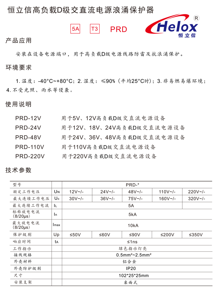 恒立信串联蓝色交直流电源防雷器(12V~220V) 5A 10kA PRD
