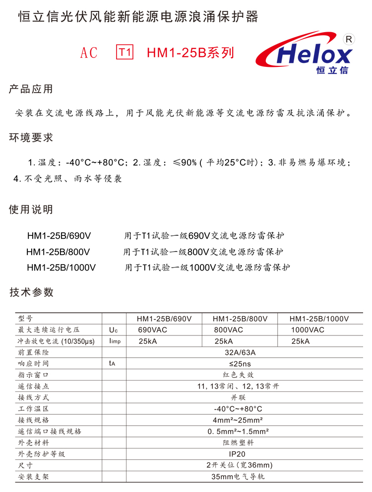恒立信T1一级2P3P4P新能源电源浪涌保护器 遥信FS(690V、750V、800V、1000V) 100KA 10/350μs 25KA HM1-25B系列