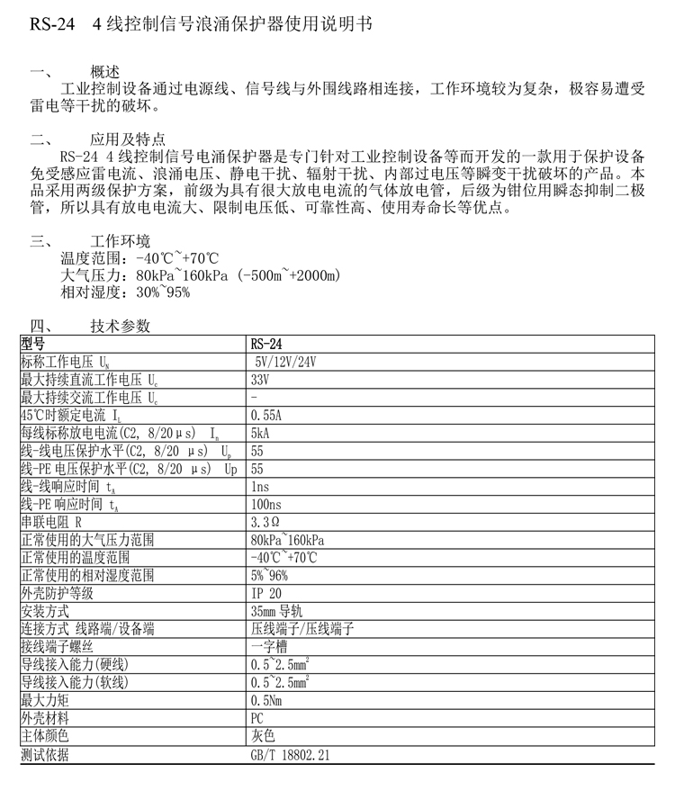 恒立信4线灰色导轨控制信号浪涌保护器 24V 10kA RS-24
