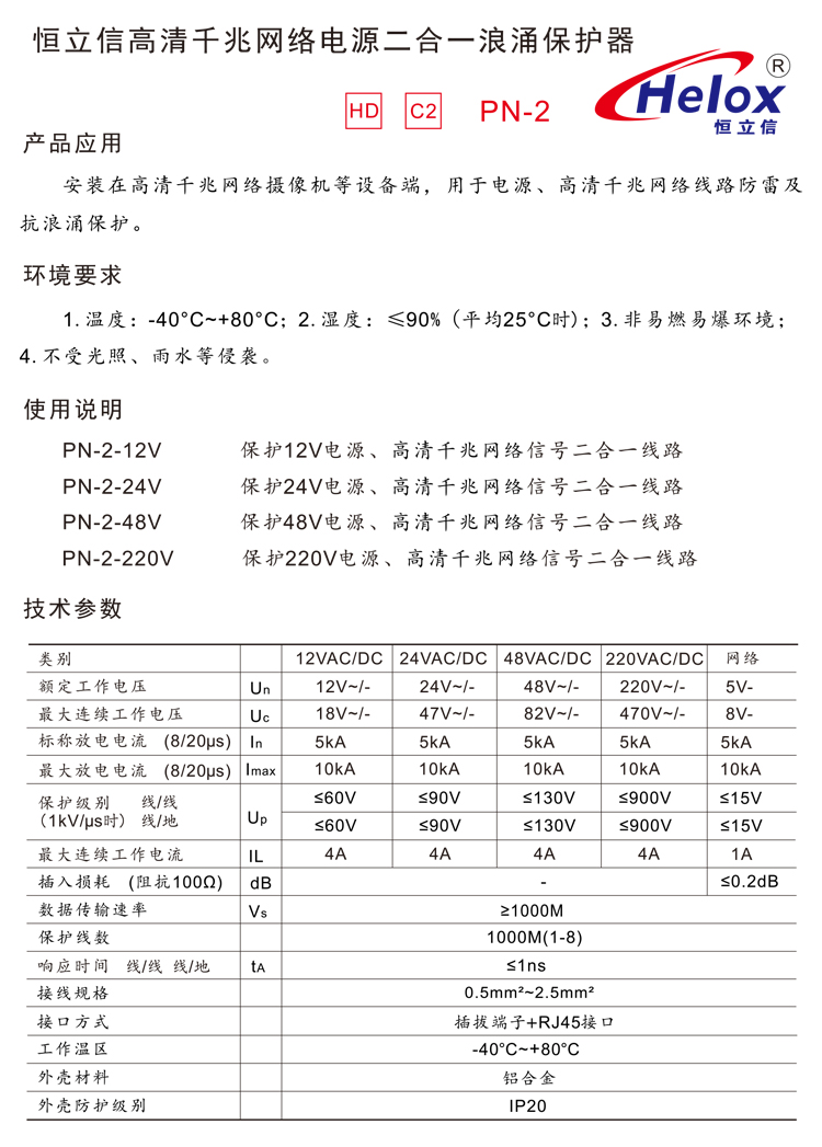 恒立信高清百兆网电源二合一浪涌保护器(12V~220V) 100M C2 10kA PN-2