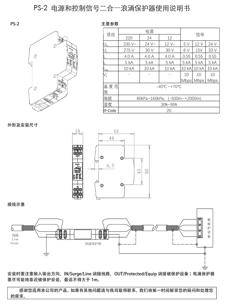 恒立信电源+RS485二合一浪涌保护器(5V~220V) C2 10kA PS-2