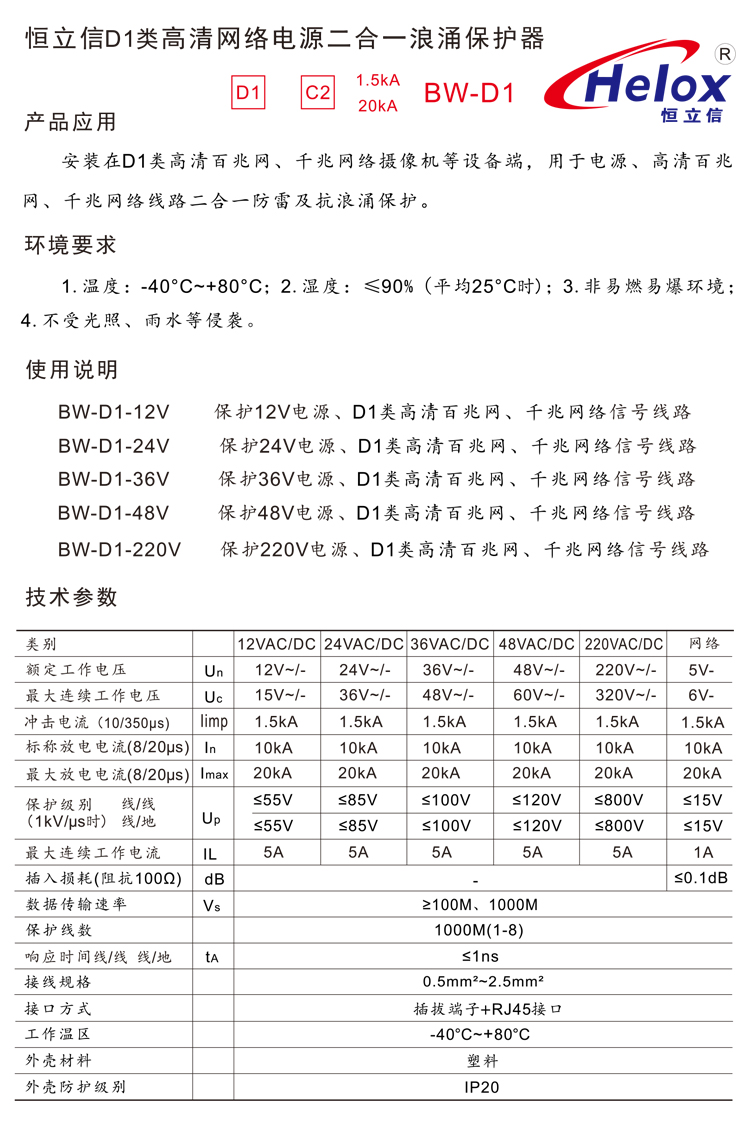恒立信D1类高清千兆网电源二合一浪涌保护器(12V~220V) 1000M 20kA BW-D1