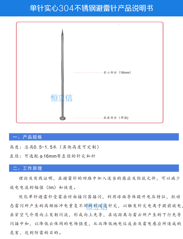 恒立信单针避雷针 直径16*32mm(1米-3米) 304不锈钢