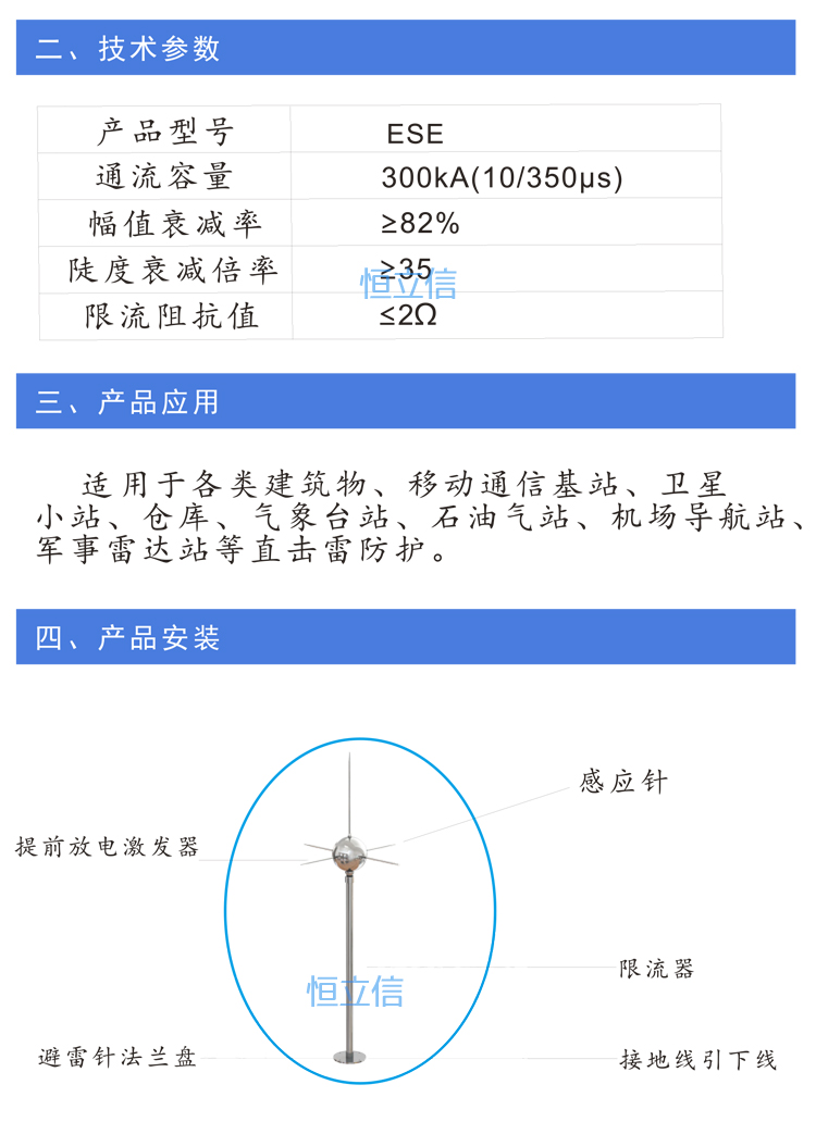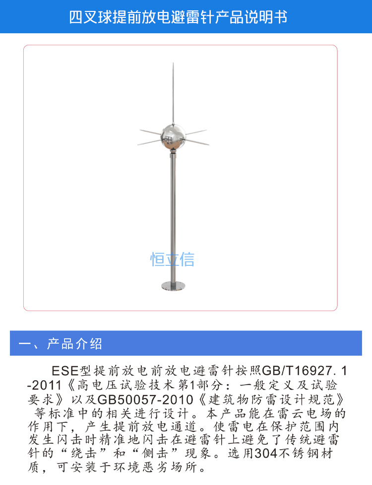 恒立信四叉球先导型提前放电避雷针(1-6米) 304不锈钢