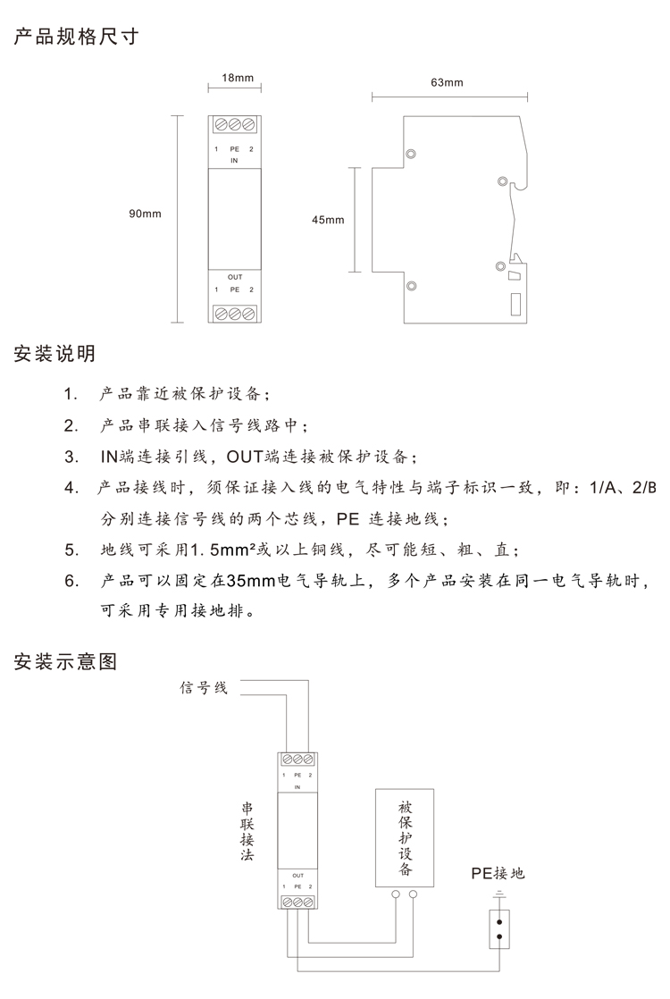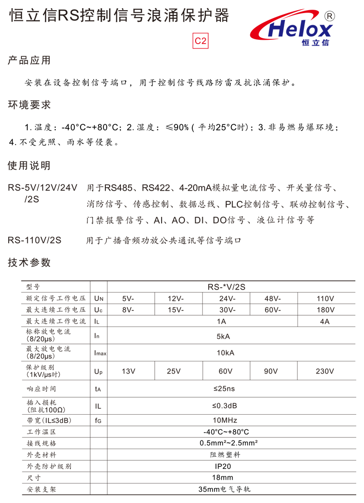 恒立信2线白色导轨控制信号浪涌保护器(5V-110V)10kA RS系列