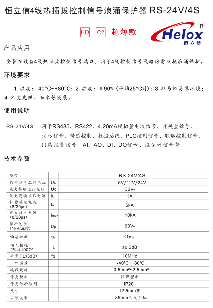 恒立信4线超薄插拔控制信号浪涌保护器(5V、12V、24V) 10kA RS-24V/4S