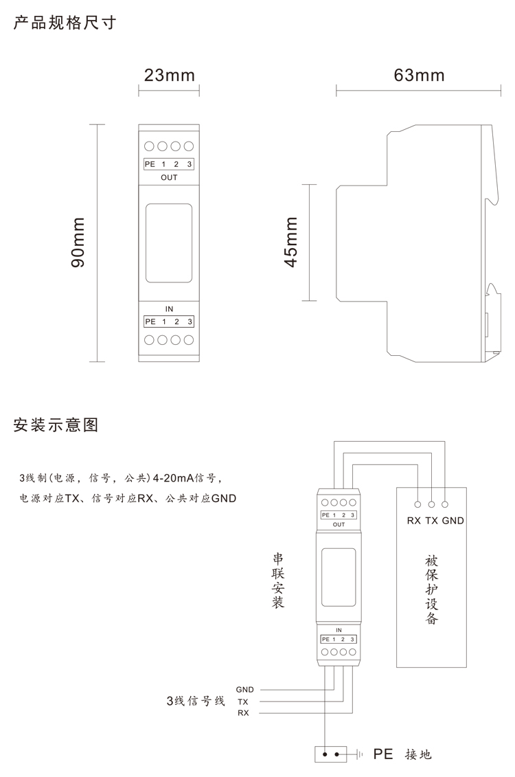 恒立信2线白色导轨高速率4-20mA PLC模拟量控制信号浪涌保护器24V 10kA PLC-24V