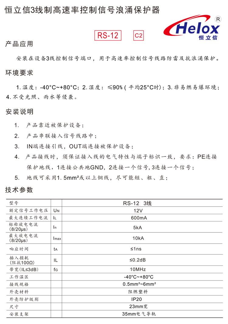 恒立信2线白色导轨控制信号浪涌保护器(5V-110V)1ns 20kA RS-*V/20