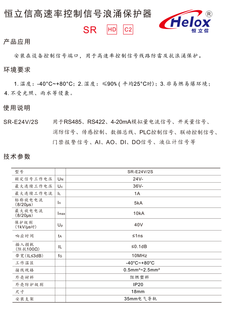 恒立信4线控制信号浪涌保护器(5V、12V、24V) 10kA SR-E24V/2S