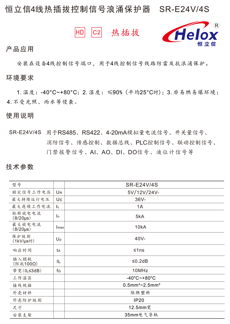 恒立信4线控制信号浪涌保护器(5V、12V、24V) 10kA SR-E24V/2S