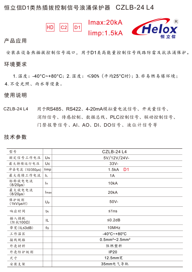 恒立信4线D1类控制信号浪涌保护器(5V、12V、24V) 20kA CZLB-24 L4
