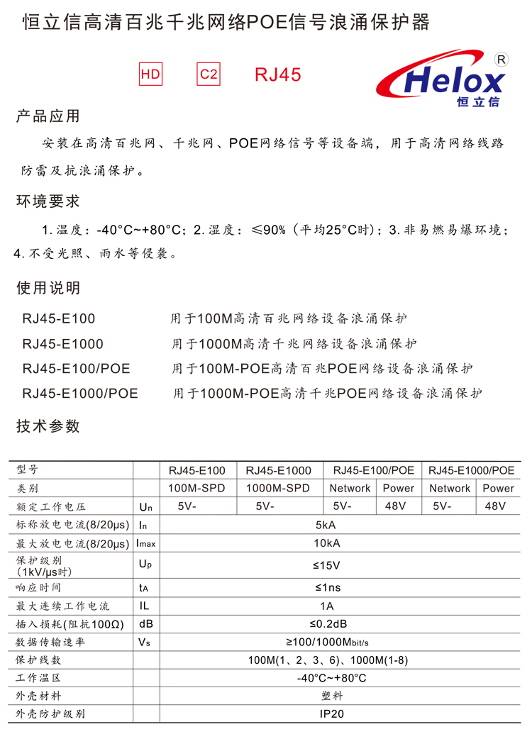 恒立信高清千兆网POE信号浪涌保护器 1000M 10kA RJ45-POE/8K