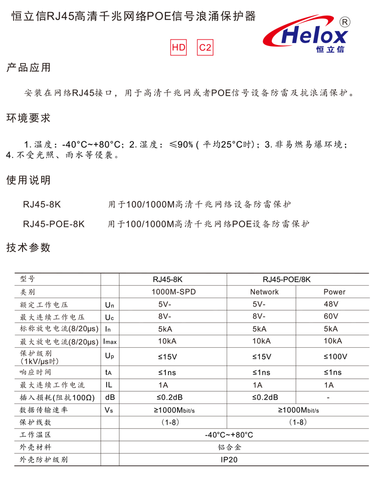 恒立信高清千兆网POE信号浪涌保护器 1000M 10kA RJ45-POE/8K
