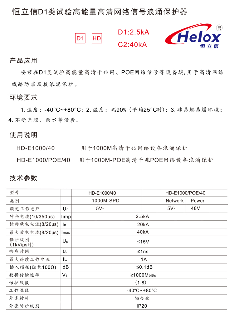 恒立信D1类高清千兆网信号浪涌保护器 1000M 40kA HD-E1000/40