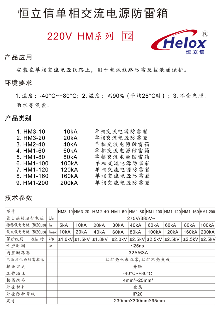 恒立信单相电220V电源防雷箱(20kA-200kA) T2 HM