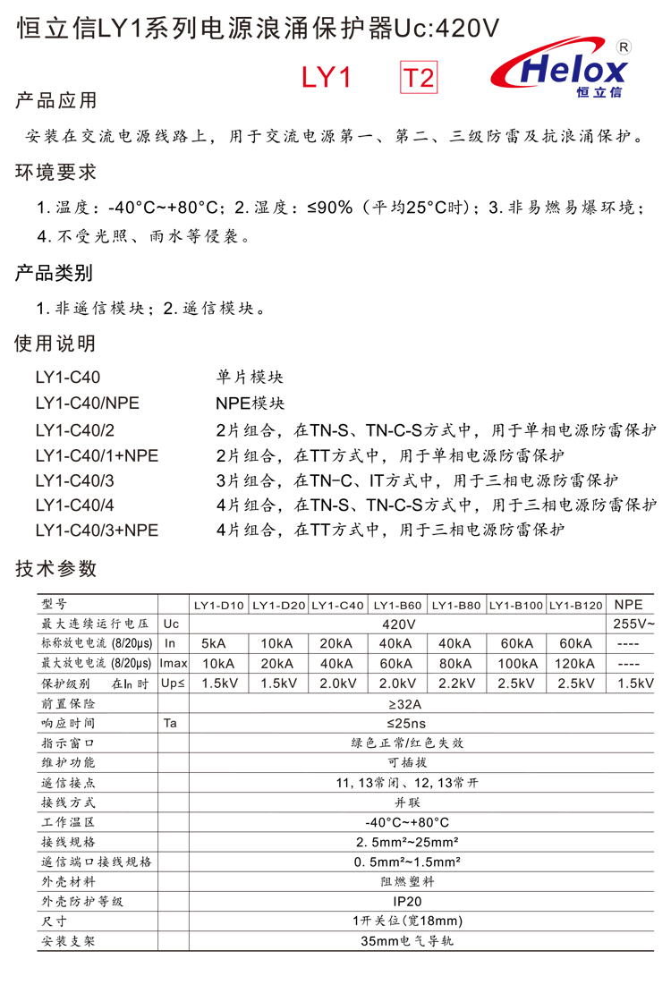 恒立信三相电380V电源防雷模块 T2 4P Uc:420V LY系列