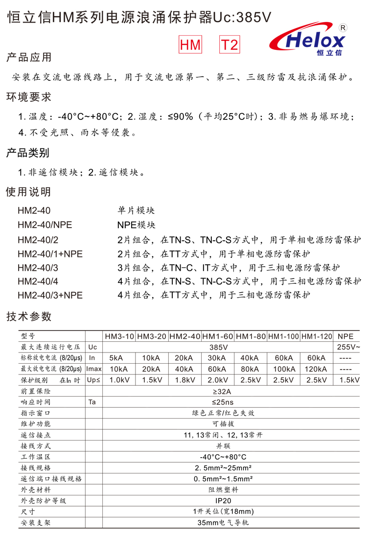 恒立信单相电220V电源防雷模块T2 2P Uc:385V HM系列 低残压