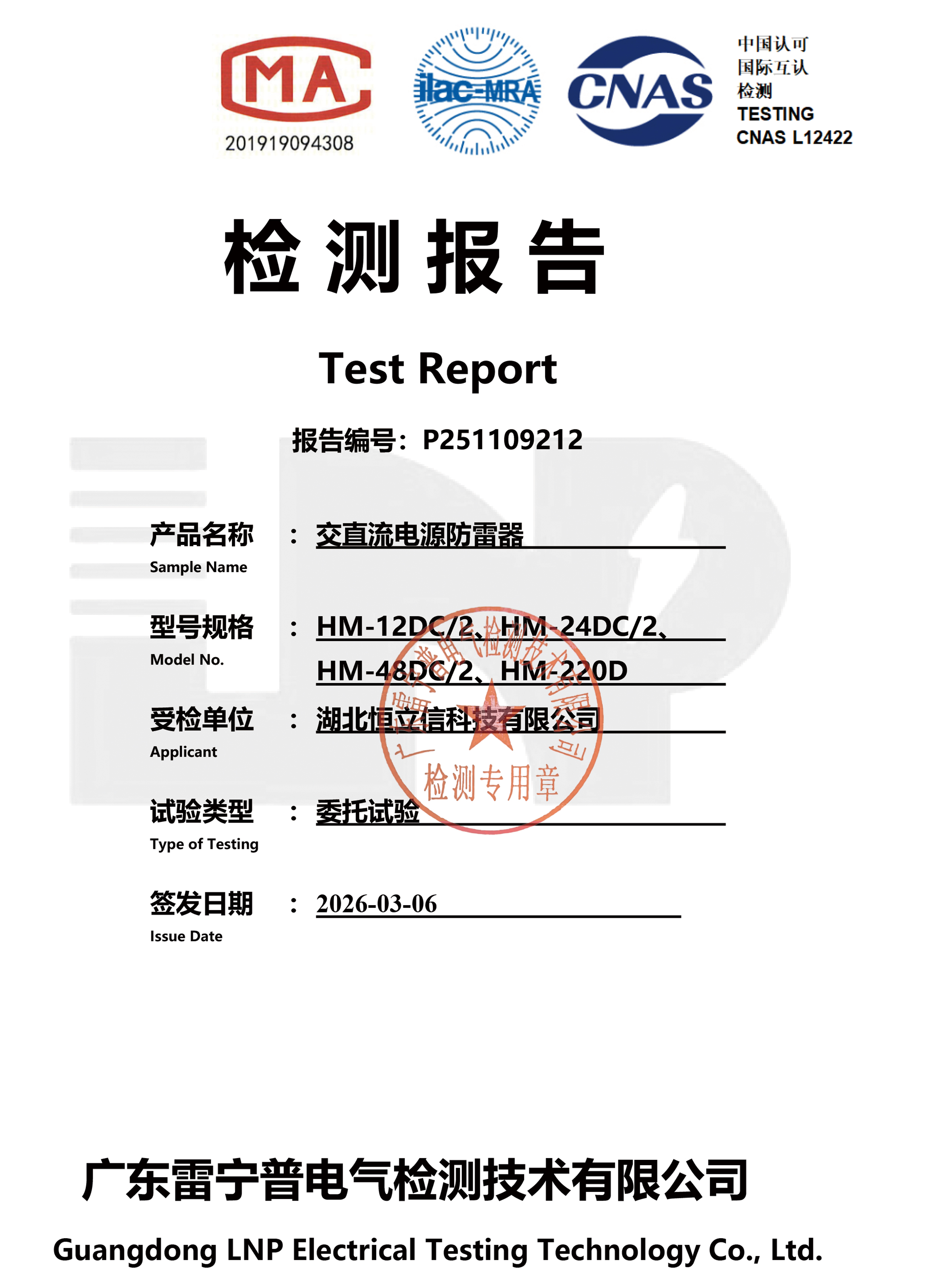 检测报告-HM-12DC-2 HM-24DC-2 HM-48DC-2 HM-220D交直流电源浪涌保护器