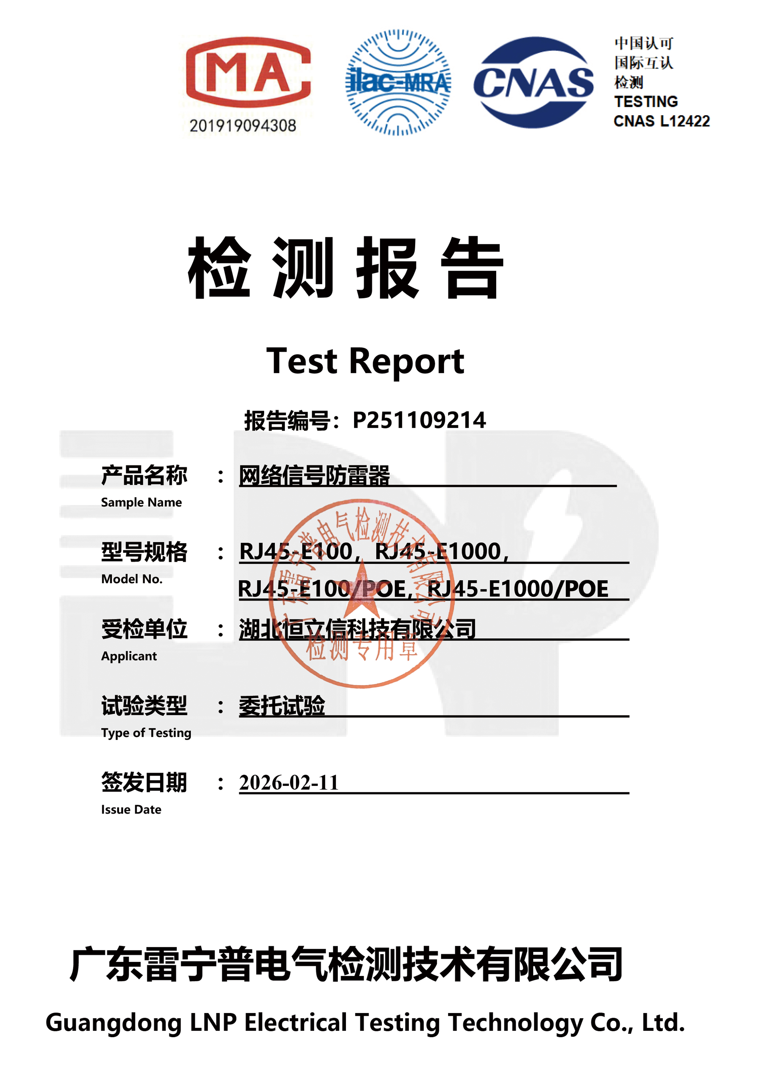 检测报告-RJ45-E100 RJ45-E1000 RJ45-E100/POE RJ45-E1000/POE网络信号浪涌保护器
